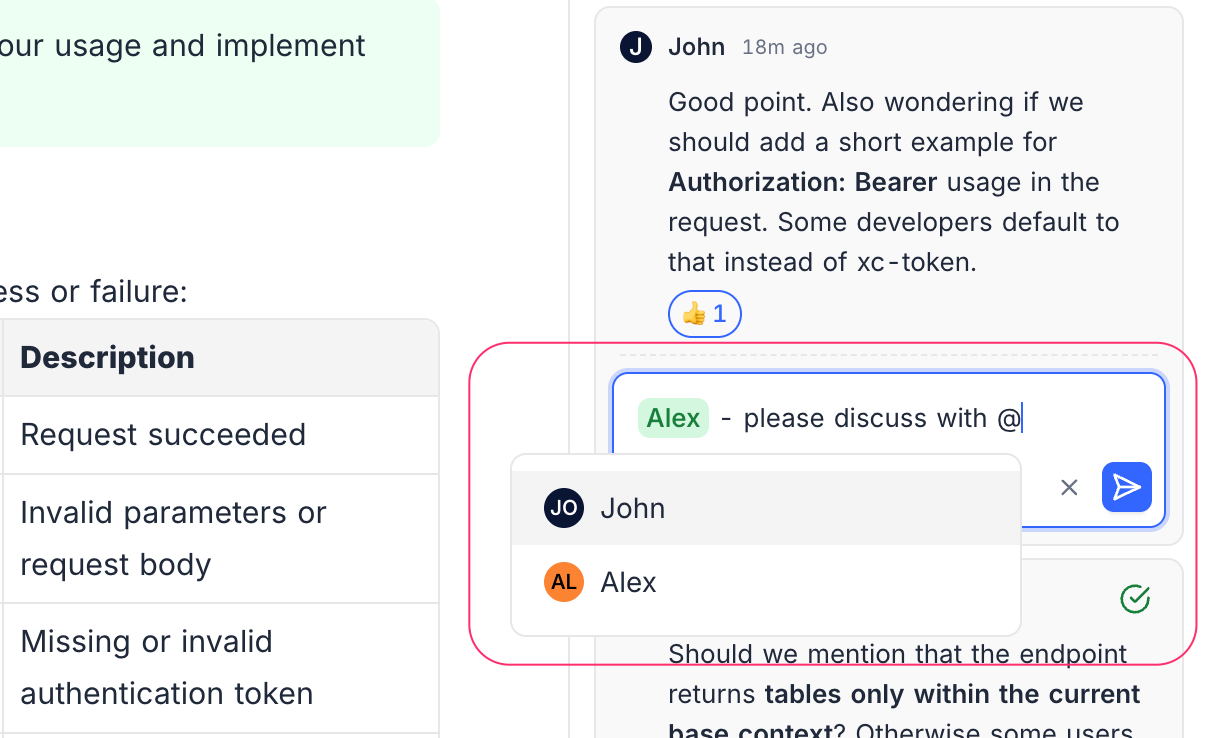 NocoDocs includes a built-in commenting system that lets team members leave feedback, discuss content, and track resolutions — all directly within the document.